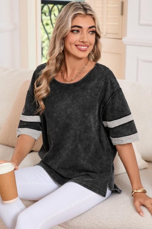 T Shirts | Women Black Vintage Stripe Sleeve Cotton T-Shirt