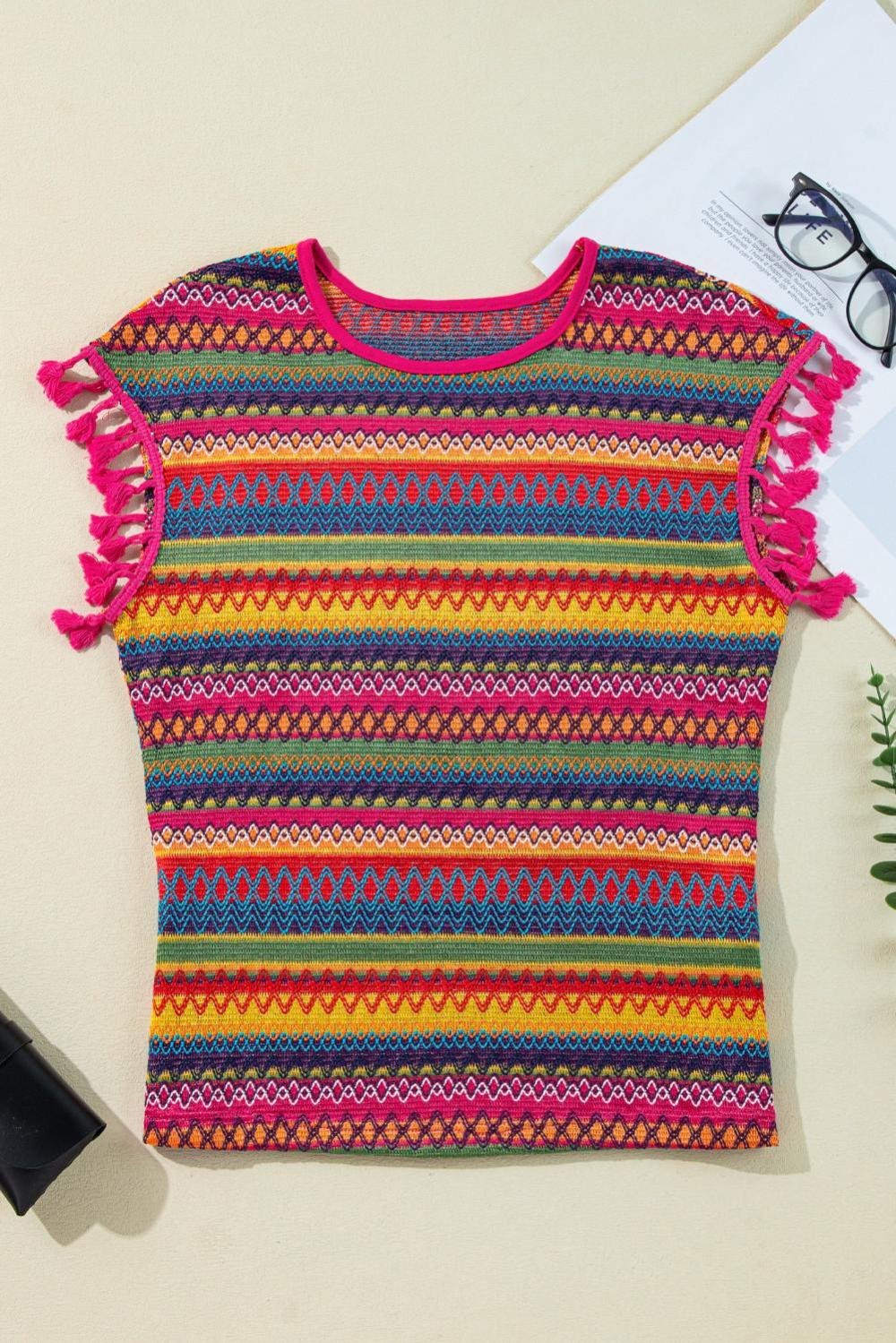 T Shirts | Women Rose Red Ethnic Textured Tassel Cap Sleeve Top